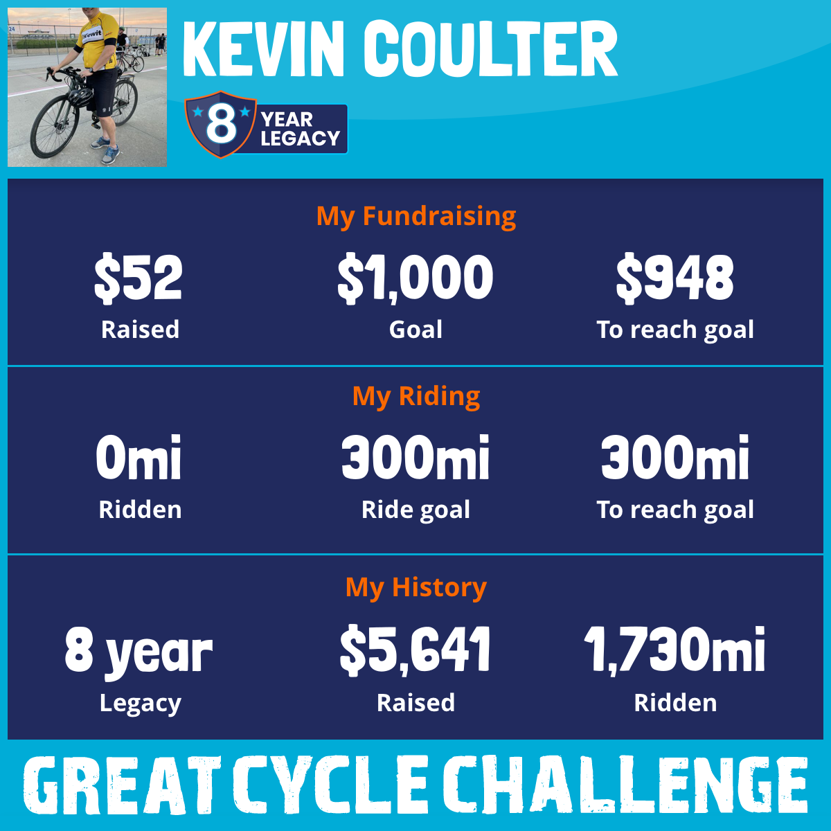 I am riding 300 mi for The Kids. Please sponsor me and support my challenge to fight kids' cancer and save little lives.