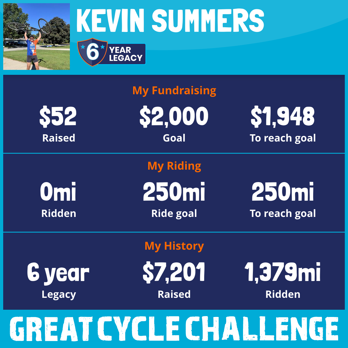 This is my SIXTH year doing this. So this year, I'm pedaling 250 miles to raise $2000!