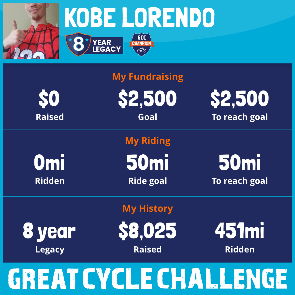 Having family members and close family friends who have battled cancer, this cause really hits close to home for me. Growing up I always tried to raise money for St. Jude's and upon participating in this challenge, I was SHOCKED to learn that the federal funding for cancer only provides less than 4% for childhood cancer. By donating through the Great Cycle Challenge, I knew the money would make a massive difference and impact towards childhood cancer.