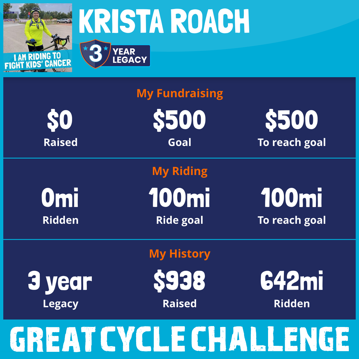 I am riding 100 mi to fight kids' cancer and save little lives. Please sponsor me to support my challenge!