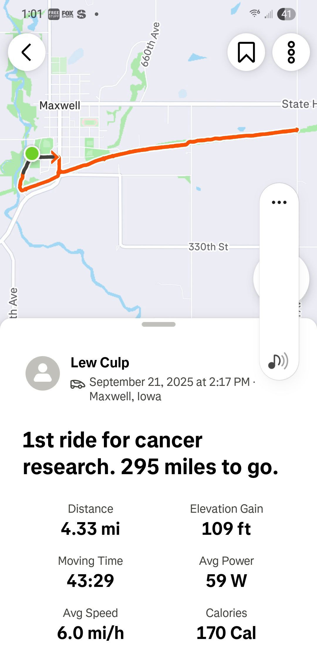 4.3 mi ride - 1st ride for cancer research. 295 miles to go - Sunday, September 21, 2025