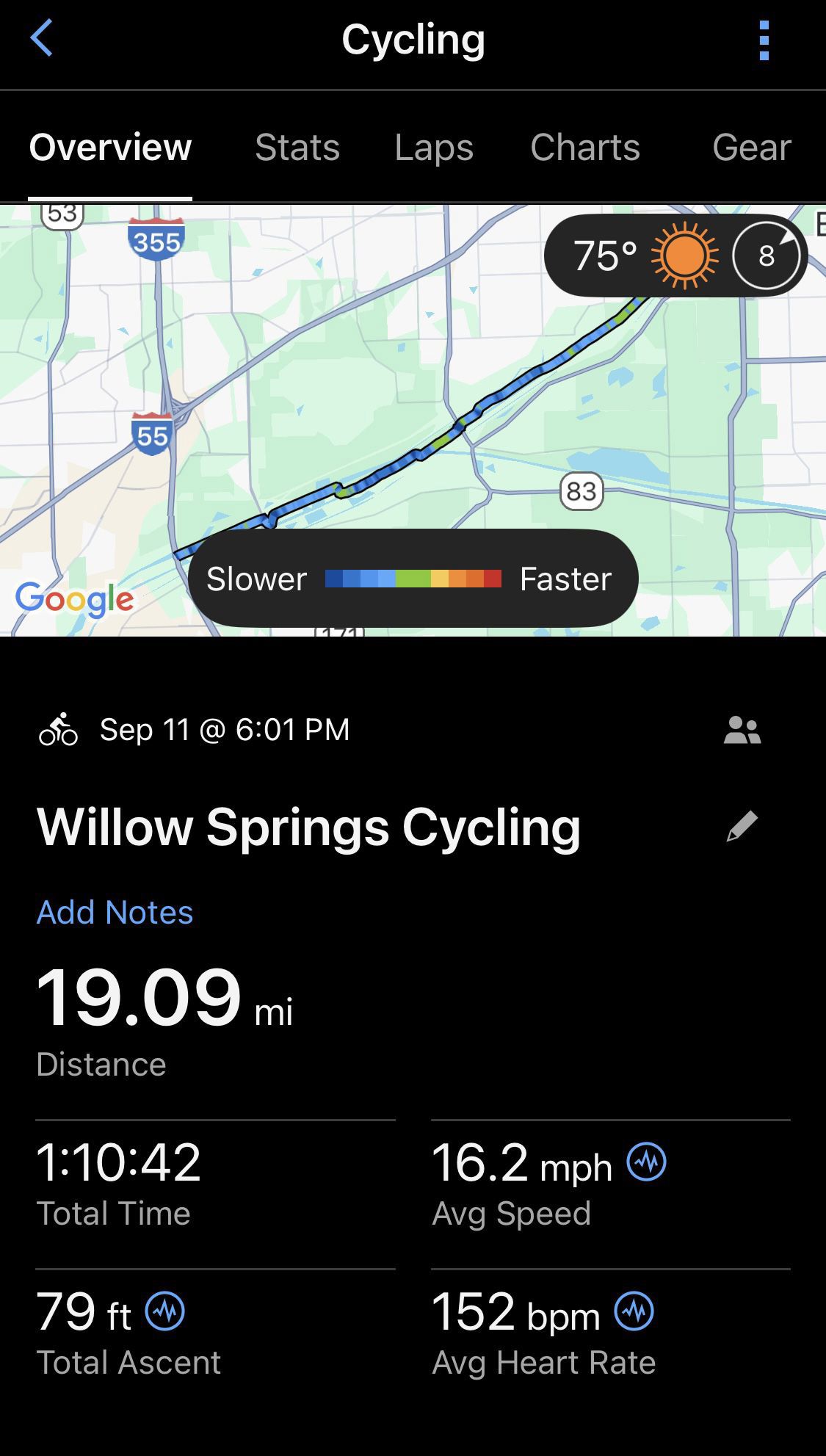 19.0 mi ride - Willow Springs Cycling - Thursday, September 11, 2025