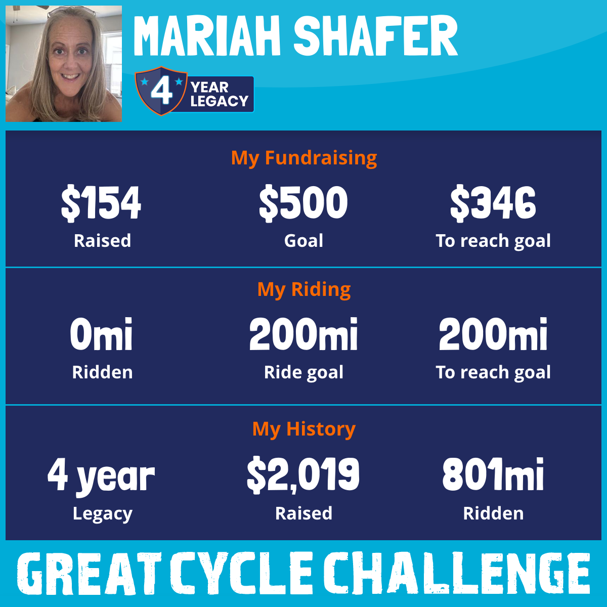 I am riding 200 mi for my daughter, Sadie Shafer. Please sponsor me and support my challenge to fight kids' cancer and save little lives.