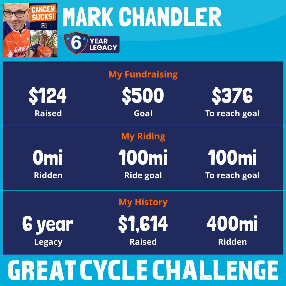 💛 Riding for Josh 💛 This year, I’m riding in the Great Cycle Challenge with someone special in mind—my friend Josh, an incredible cancer survivor. Josh faced one of life’s toughest battles with courage, grit, and grace. His strength through treatment and recovery continues to inspire me—and reminds me that cancer doesn’t care how old you are. But neither does hope. While this challenge is focused on raising funds for kids’ cancer research, I ride with Josh in my heart. His fight fuels my own effort to ride 100 miles and raise $500 for the Children’s Cancer Research Fund, to help give kids the same chance at survival that Josh fought so hard for. This ride is for you, Josh—for your story, your resilience, and the countless lives you continue to impact. And it’s for every child still in the fight. Let’s ride. Let’s fight. Let’s end cancer—together. 🚴♂️💛