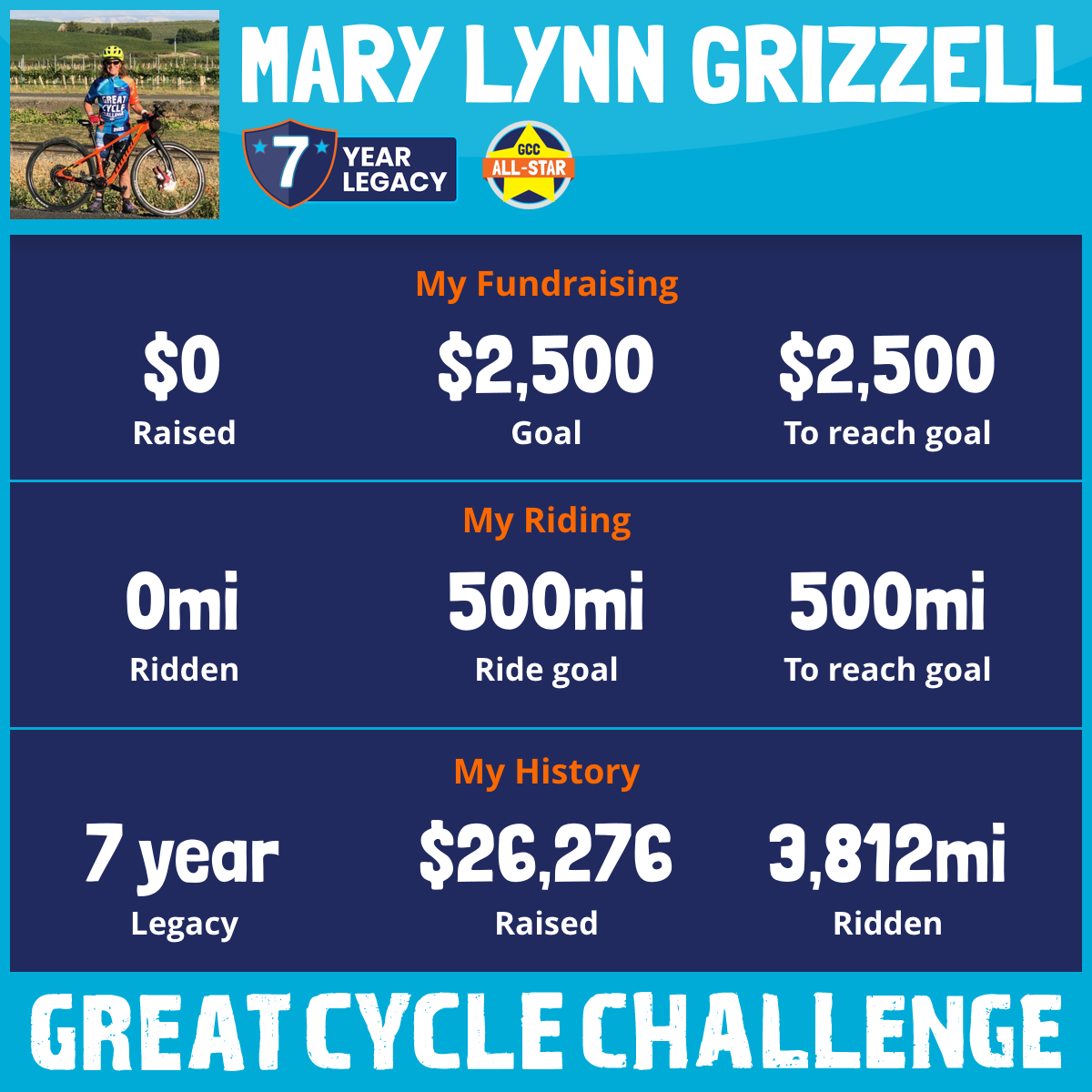 This September, will be my seventh year in taking part in the Great Cycle Challenge to fight kids' cancer! Last year with your support, together we raised over $3,600. I believe we can raise $4,500! Over the last six years, we have raised over $26,000. Let's make it over $30,000. Thank you for "riding" with me!