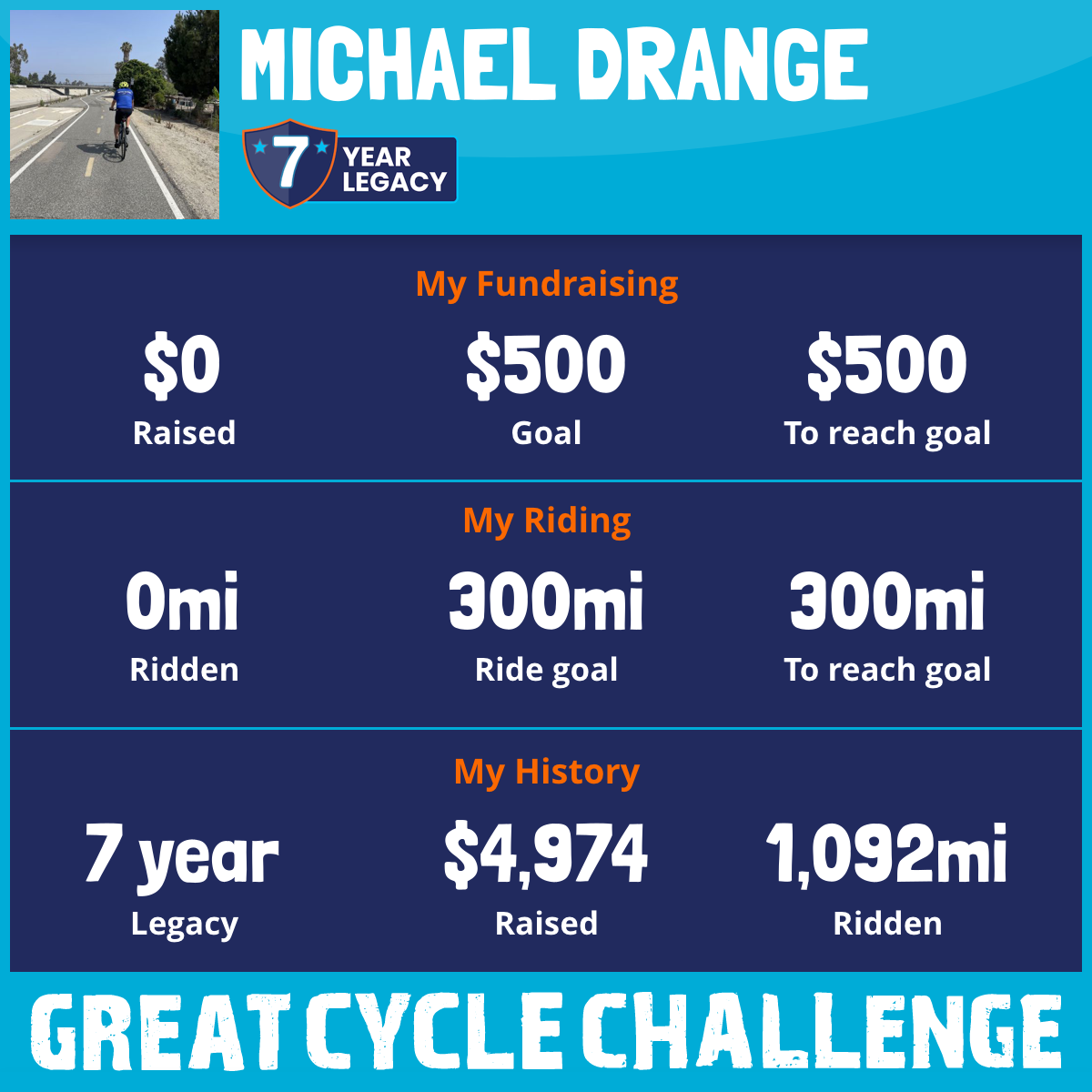 This September I will be riding in my sixth Great Cycling Challenge to help fight kids cancer. My goal is to log 250 miles. I hope you will support me in the fight against children's cancer.