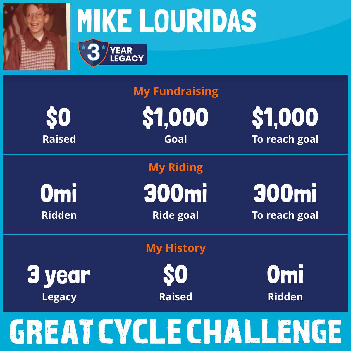 I am riding 400 mi in memory of George Louridas my brother. Please sponsor me and support my challenge to fight kids' cancer and save little lives.