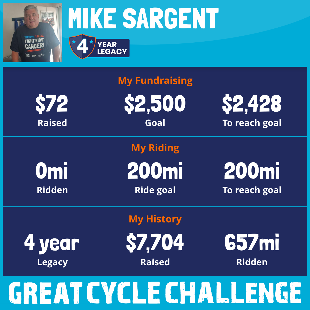 28 Aug 2025I'm only $145 from my goal of raising $2500 for the 3rd year in a row. Riding starts Monday and I can't wait! If you can, please donate whatever you can put me over the top!