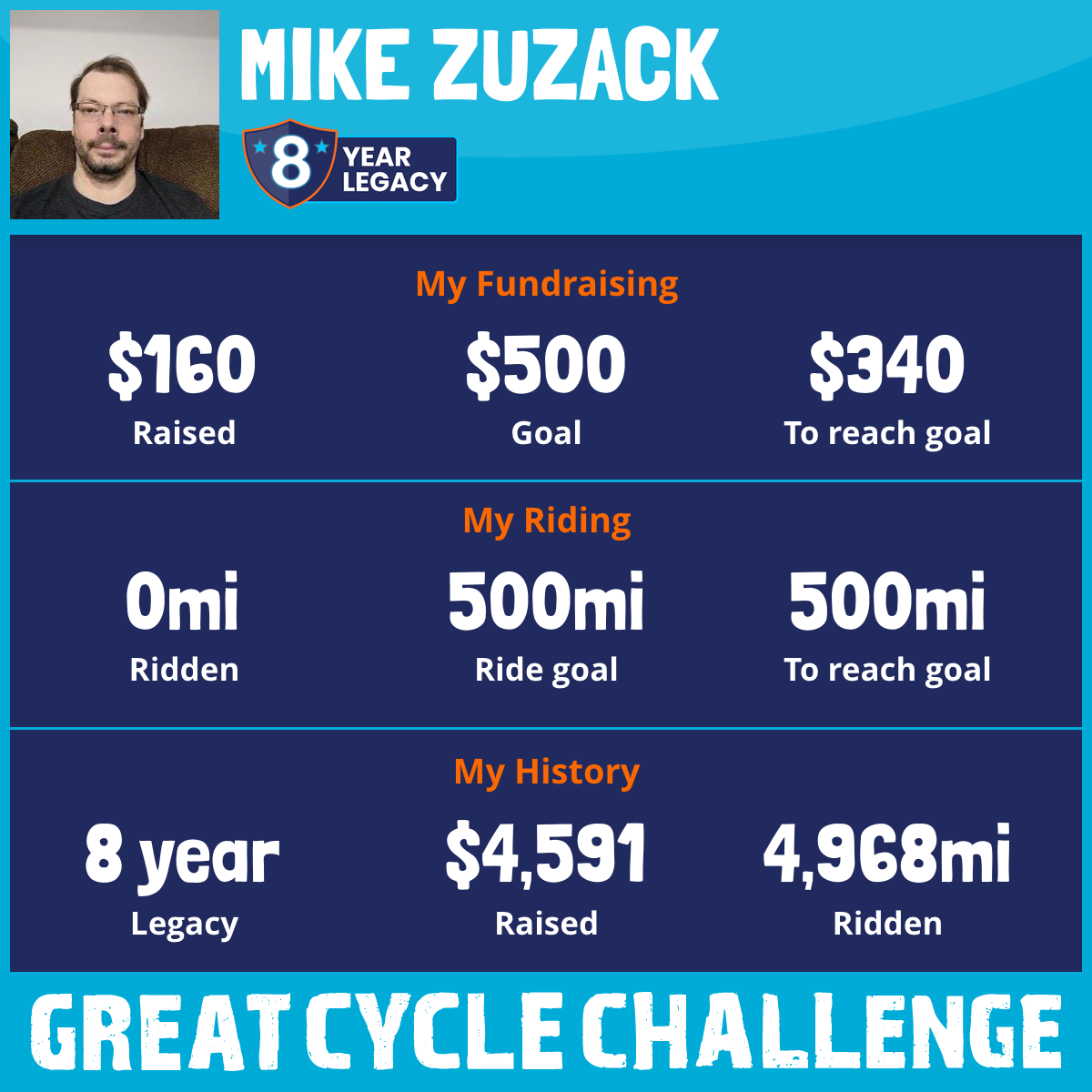 I am riding 500 mi in memory of Katherine zuzack, William Zuzack, Judi Zuzack. Please sponsor me and support my challenge to fight kids' cancer and save little lives.