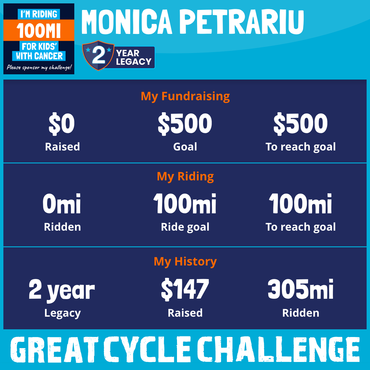 I am riding 100 mi to fight kids' cancer and save little lives. Please sponsor me to support my challenge!