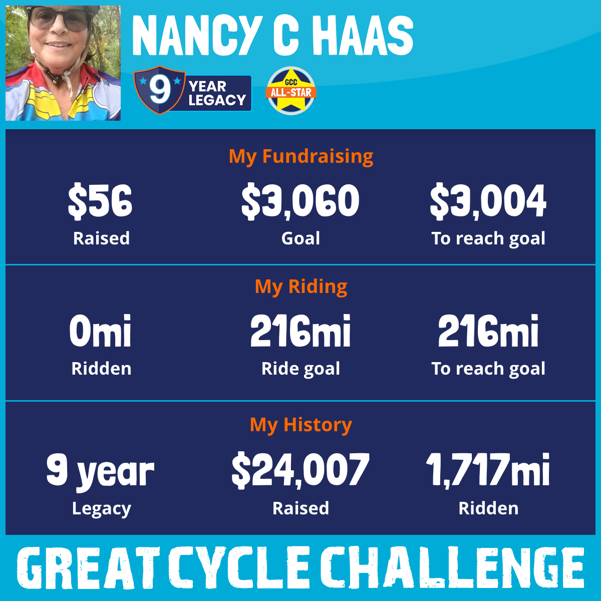 This will be my 9th year participating in the Great Cycle Challenge.
