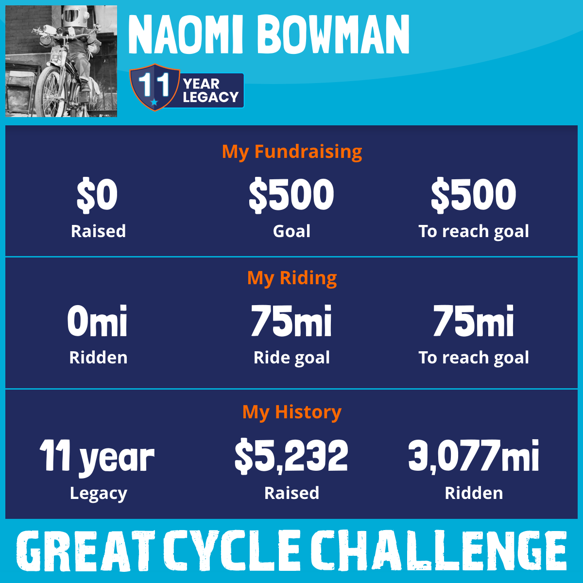 So that's why I'm riding in the Great Cycle Challenge, to raise funds for research to end childhood cancer and save little lives.