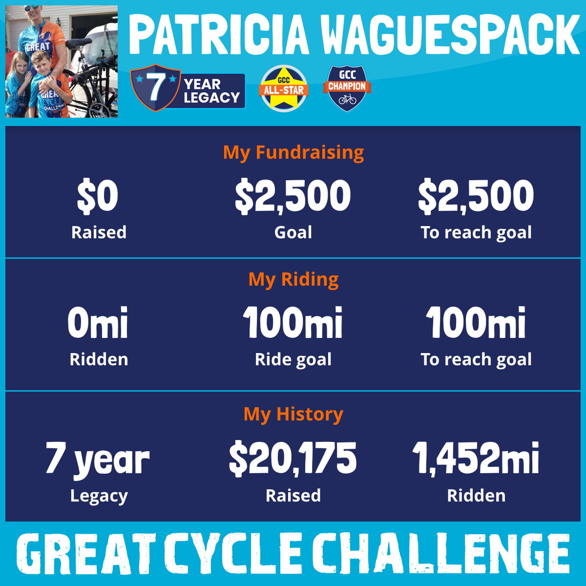 This is my 6th year riding in The Great Cycle Challenge for The Children's Cancer Research Fund and my goal is to reach a lifetime fundraising milestone of $20,000 by raising $3,000 this year.