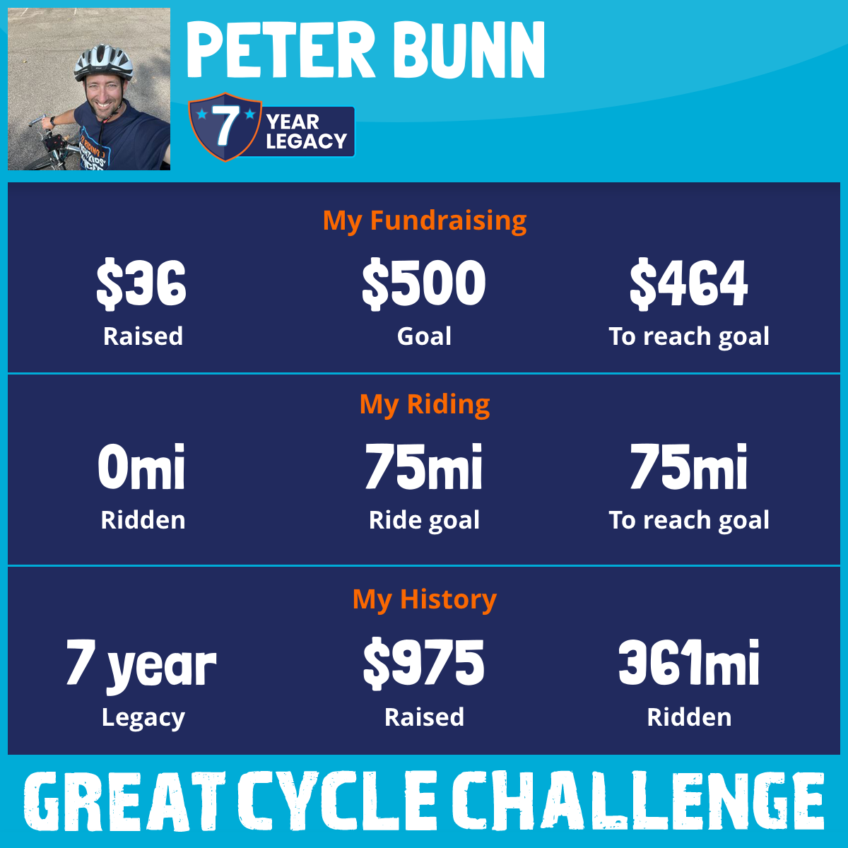 I am riding 75 mi for Daniel Bunn. Please sponsor me and support my challenge to fight kids' cancer and save little lives.