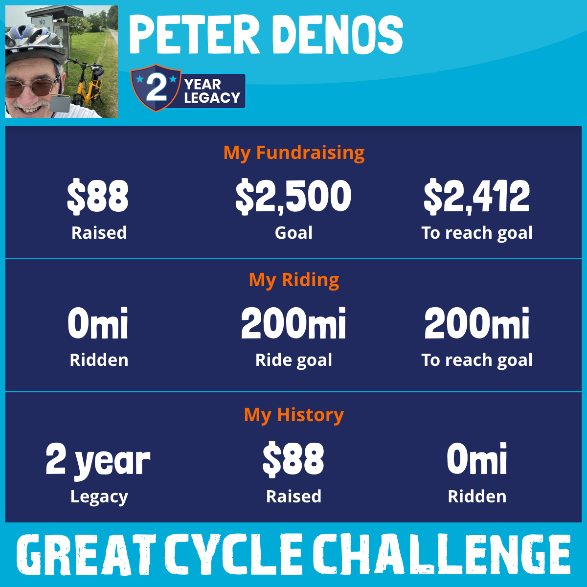 I am riding 200 mi in memory of my brother, Jim Denos. Please sponsor me and support my challenge to fight kids' cancer and save little lives.