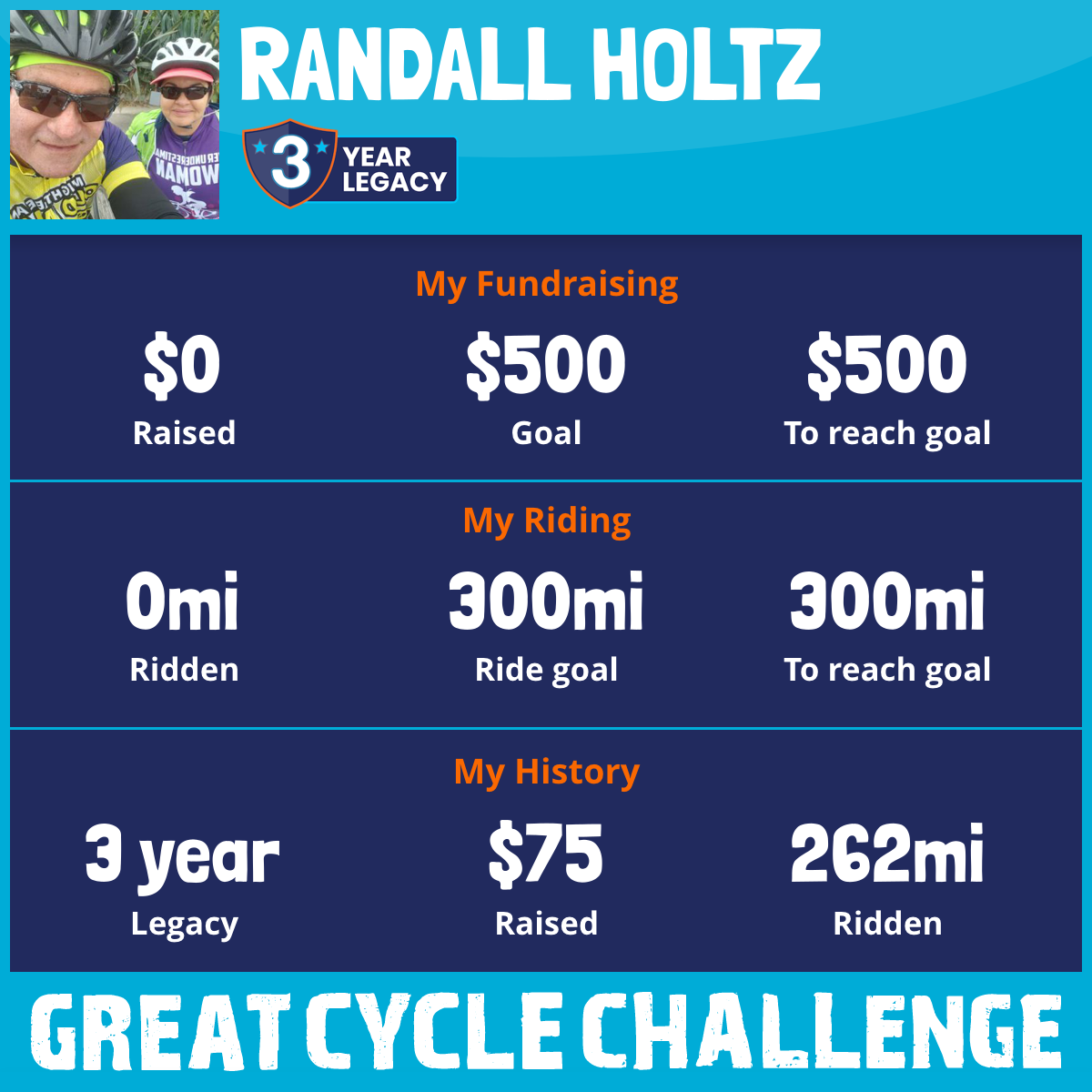 I am riding 300 mi for Randall Holtz. Please sponsor me and support my challenge to fight kids' cancer and save little lives.