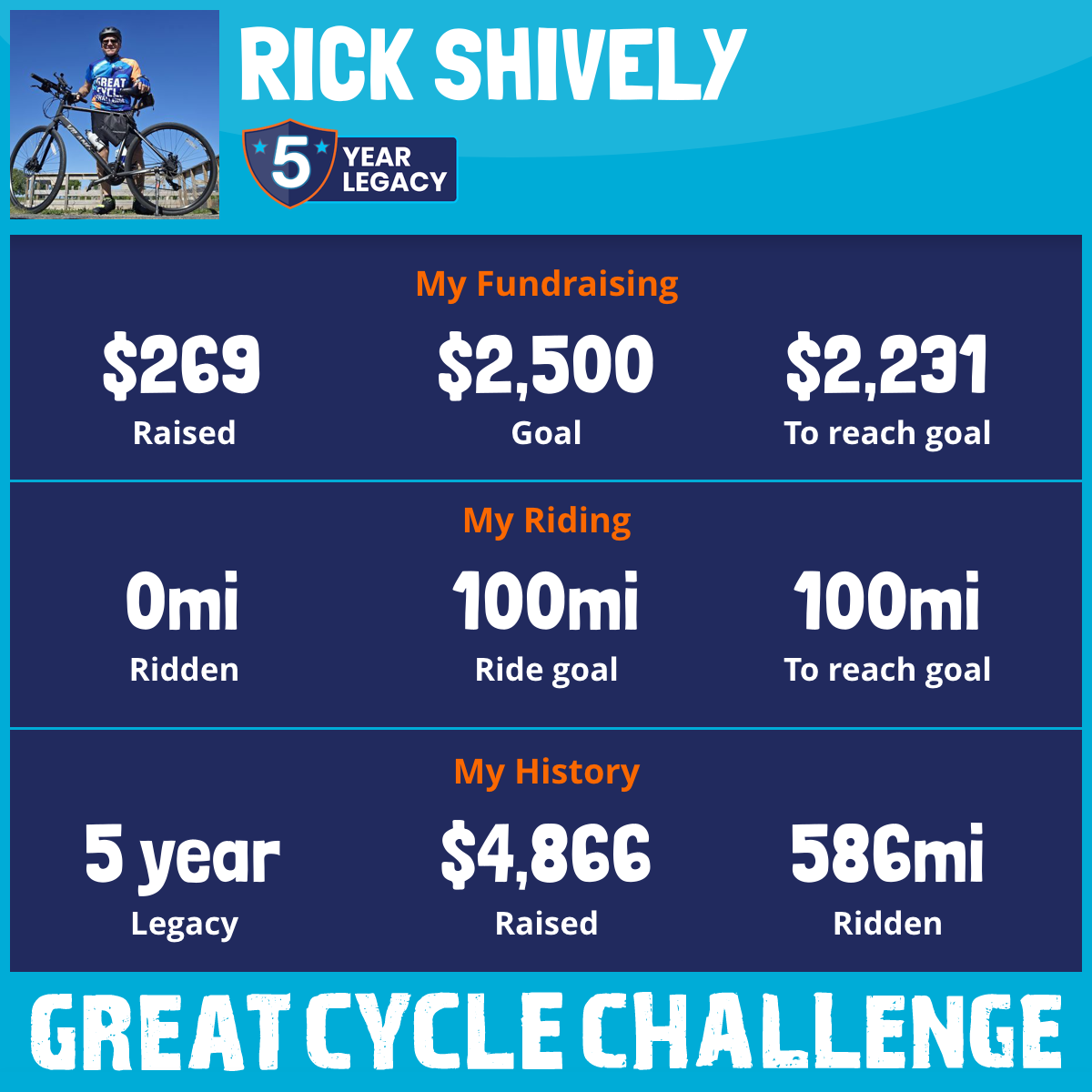 This September 2025, I am again taking part in the Great Cycle Challenge to fight kids' cancer! I have completed 4 years riding the Great Cycle Challenge. This is my 5th year riding this campaign. Since 2021, I have raised almost $5,000. This year I want to bump that total by 50%. My stretch goal for donations is $2,500 this year!