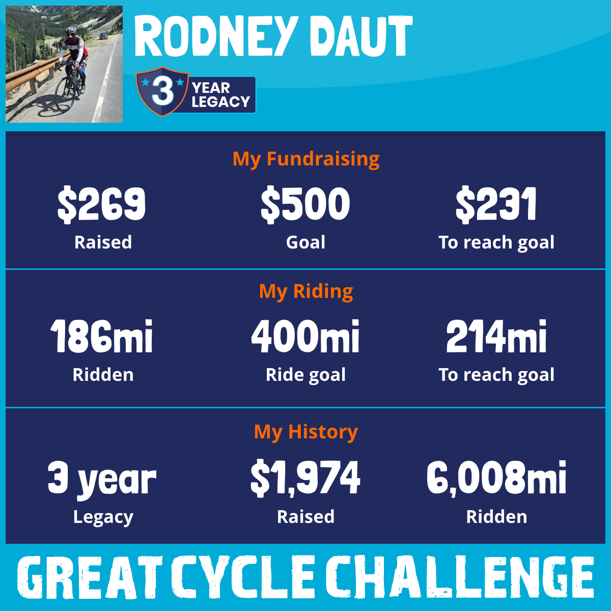 4,185 mi Ridden$500 Raised2015
