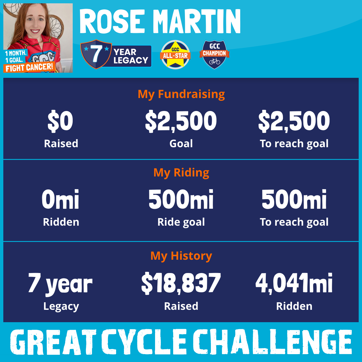 This September, I am taking part in the Great Cycle Challenge to fight kids' cancer! I will add a mile for every dollar donated up to 500 miles total in one month! Help me raise $2,500 for kids who need it! Every dollar gets us closer to beating cancer.