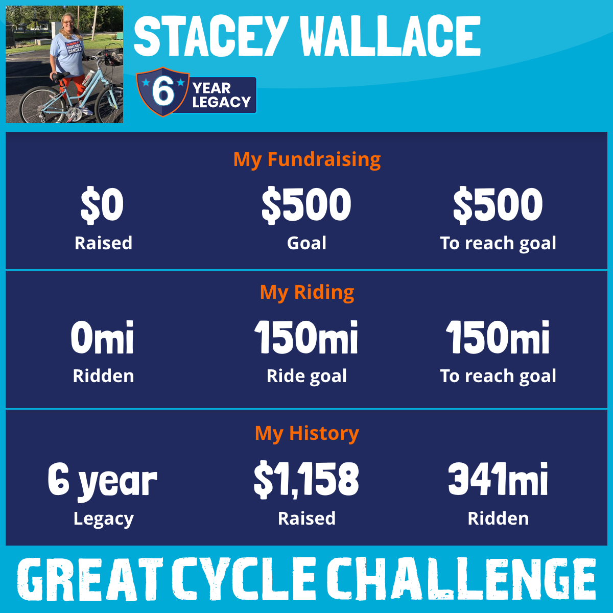 This September, I am taking part in the Great Cycle Challenge to fight kids' cancer once again! This is my 5th year! My daughter is beginning her 6th year and I have joined her team, "Faith Over Fear", in honor of a friend's son we lost September 2020 due to cancer. He was a teenager who could be looked up to by his peers and loved God with all his heart.