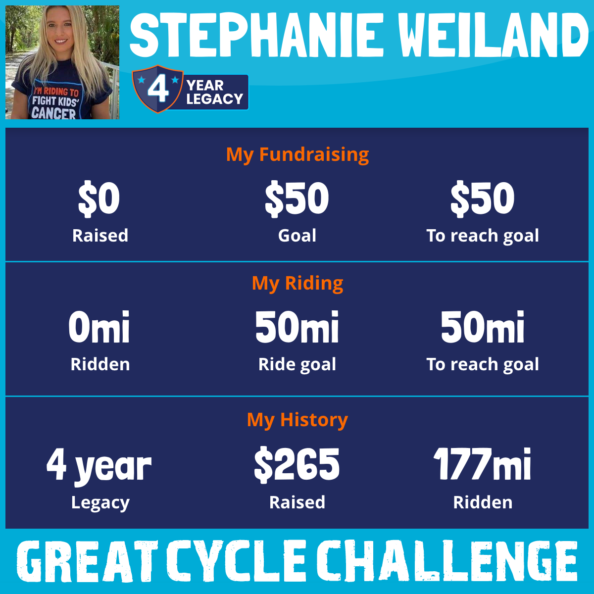 I am riding 50 mi in memory of my cousin, Luisa. Please sponsor me and support my challenge to fight kids' cancer and save little lives.