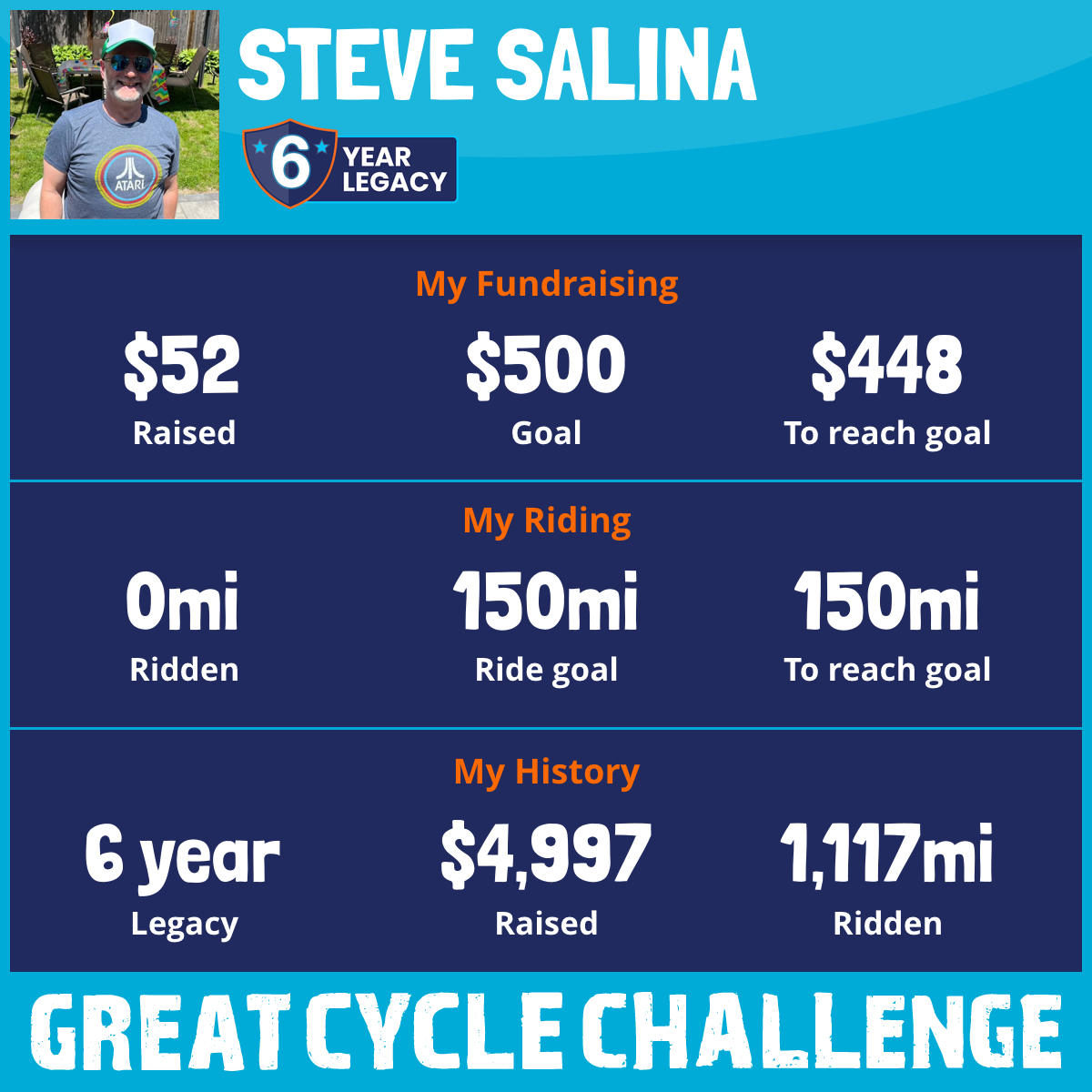 Hi all. I've signed up for the 2025 Great Cycle Challenge and will be riding this September to fight kids' cancer! This is my sixth year doing this, and it's such a worthy cause! My goal is to pedal 150 miles throughout the month. Why am I doing this? Because cancer is the largest killer of children from disease in the United States - 38 children die of cancer every week. My challenge will be tough, but it's nothing compared to what these brave kids and their families face every day of their lives as they battle this terrible disease. Kids should be living life, NOT fighting for it. And so I am taking on this challenge to end childhood cancer and save little lives. Please support me by making a donation. All funds raised will support Children's Cancer Research Fund to continue their work to develop innovative treatments and find a cure for childhood cancer. Any donation, no matter how big or small, is greatly appreciated!!