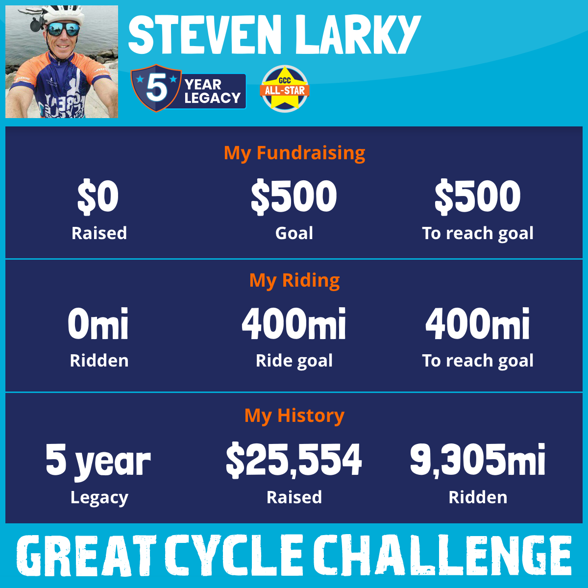 This is my fifth year biking in the Great Cycle Challenge to support research to end childhood cancer.