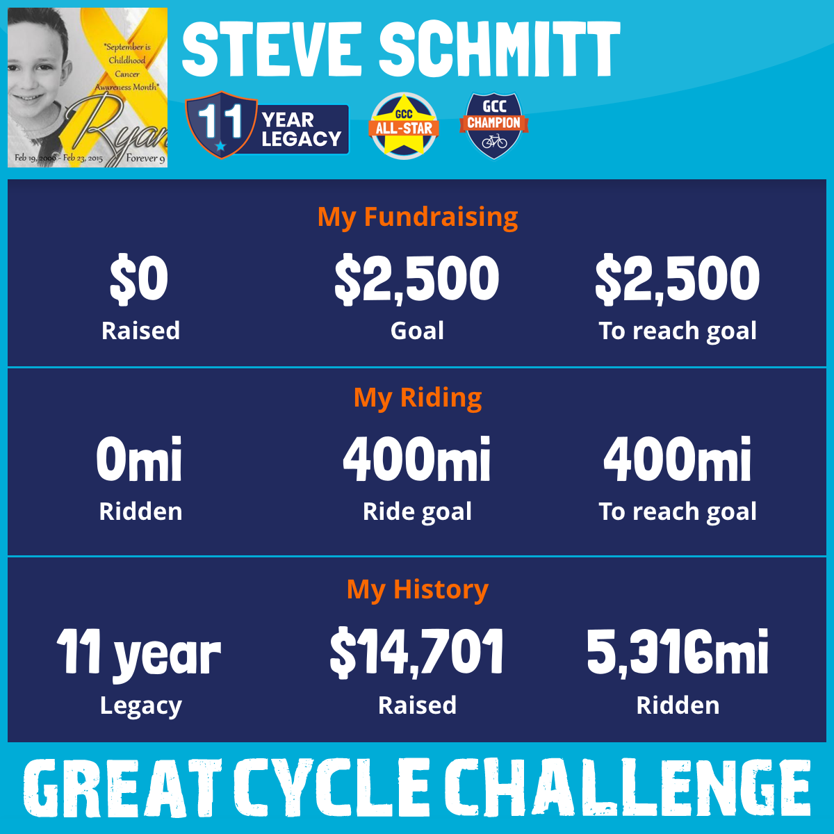 This September, I am taking part in the Great Cycle Challenge to fight kids' cancer! Why? Because right now, cancer is the biggest killer of children from disease in the United States. Over 15,700 children are diagnosed every year, and sadly, 38 children die of cancer every week. . This year I am raising money for the kids, in the name of Ryan, but inspired by my sister who lost her fight to cancer a few years back!!