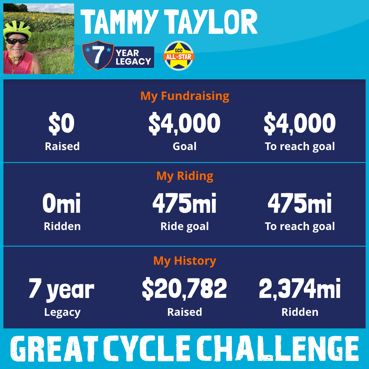 I am excited to ride again in the Great Cycle Challenge! This is my seventh year participating, and this year I will attempt my highest GCC mileage goal...475 miles! Thank you to all who have supported me over the years! Together we have raised $20,782.42 and ridden 2,373.8 miles! I'm excited to see what we achieve in 2025!