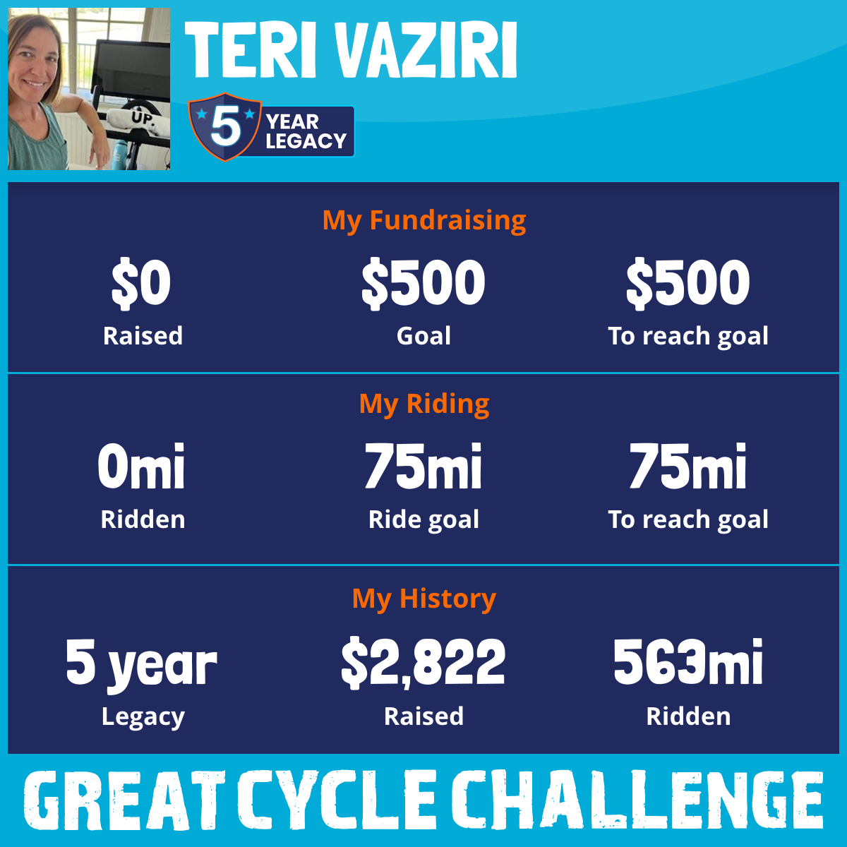 It's Cancer Awareness month and for the 5th year, I'm taking part in the Great Cycle Challenge to fight kids' cancer! I'm riding 75 miles in September and hope to raise $500.
