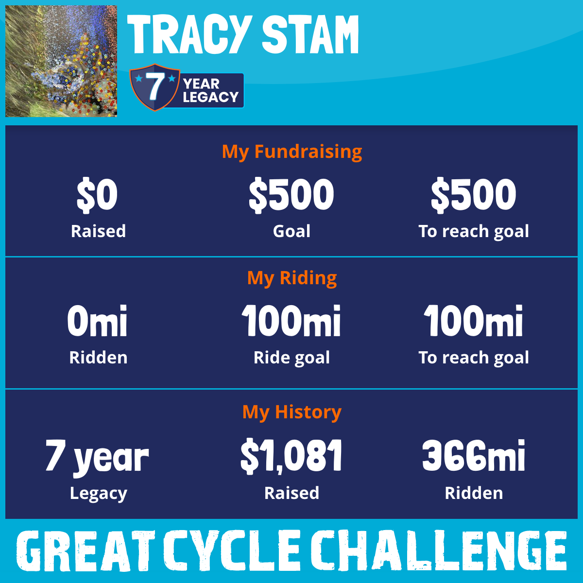 Year #7!!!! Now retired and able to enjoy the ride. I am taking part in the Great Cycle Challenge to help fight kid’s cancer.