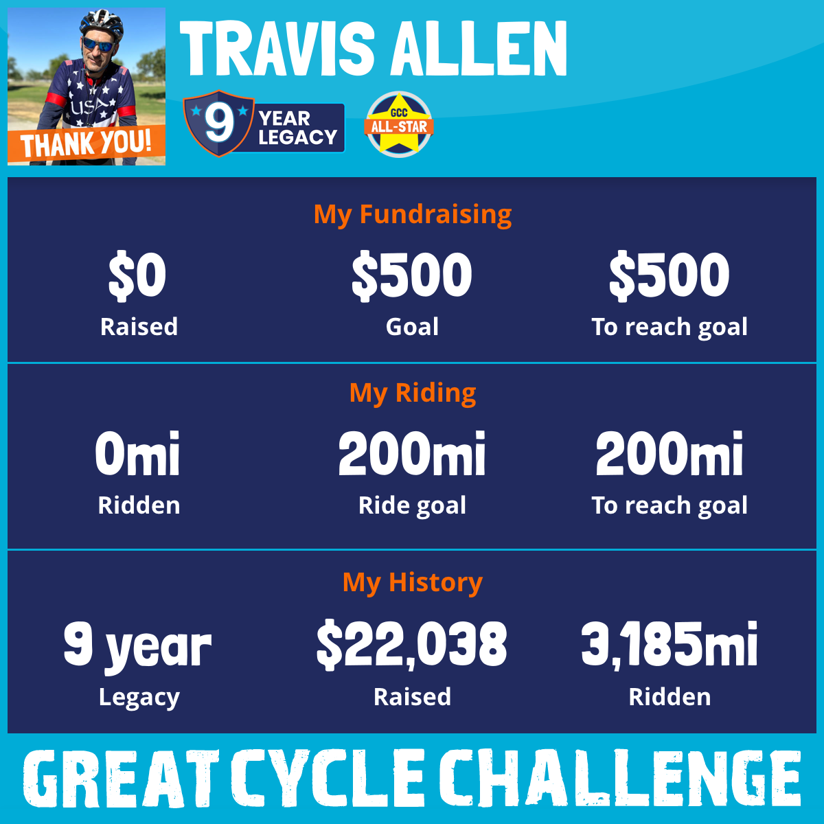 Please visit my donation page at https://greatcyclechallenge.com/Riders/TravisAllen/v to contribute today and your contribution will be matched by others who support this cause and in effect doubling it. Your support is greatly appreciated and will continue the important mission of the Children's Cancer Research Fund to find a cure for childhood Cancer.