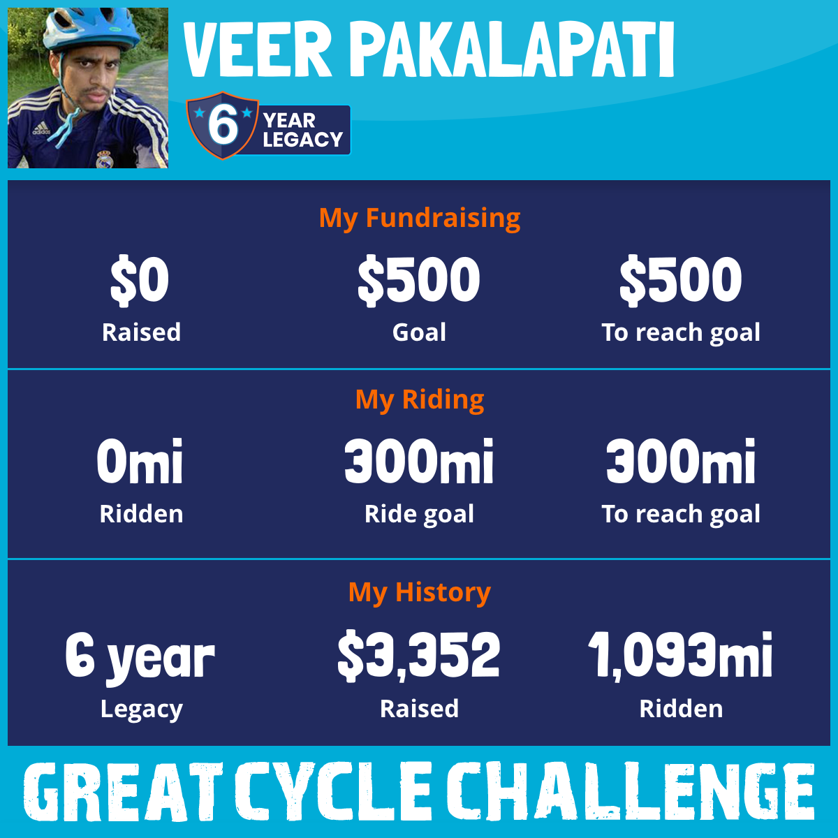 I've raised $0 My goal is $500 Donate Now