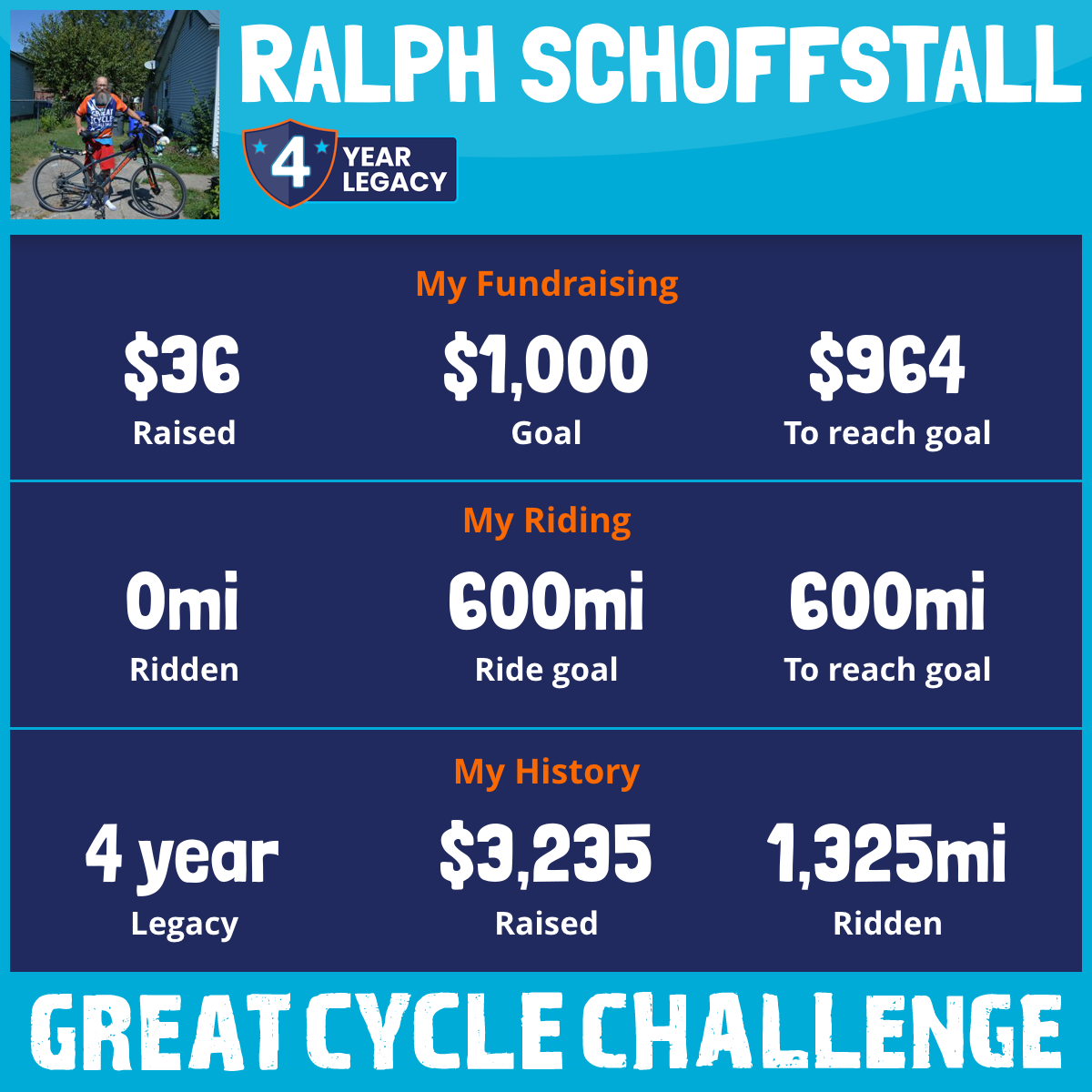 I am riding 500 mi for Cayden, Anja, Loria Zito. Please sponsor me and support my challenge to fight kids' cancer and save little lives.