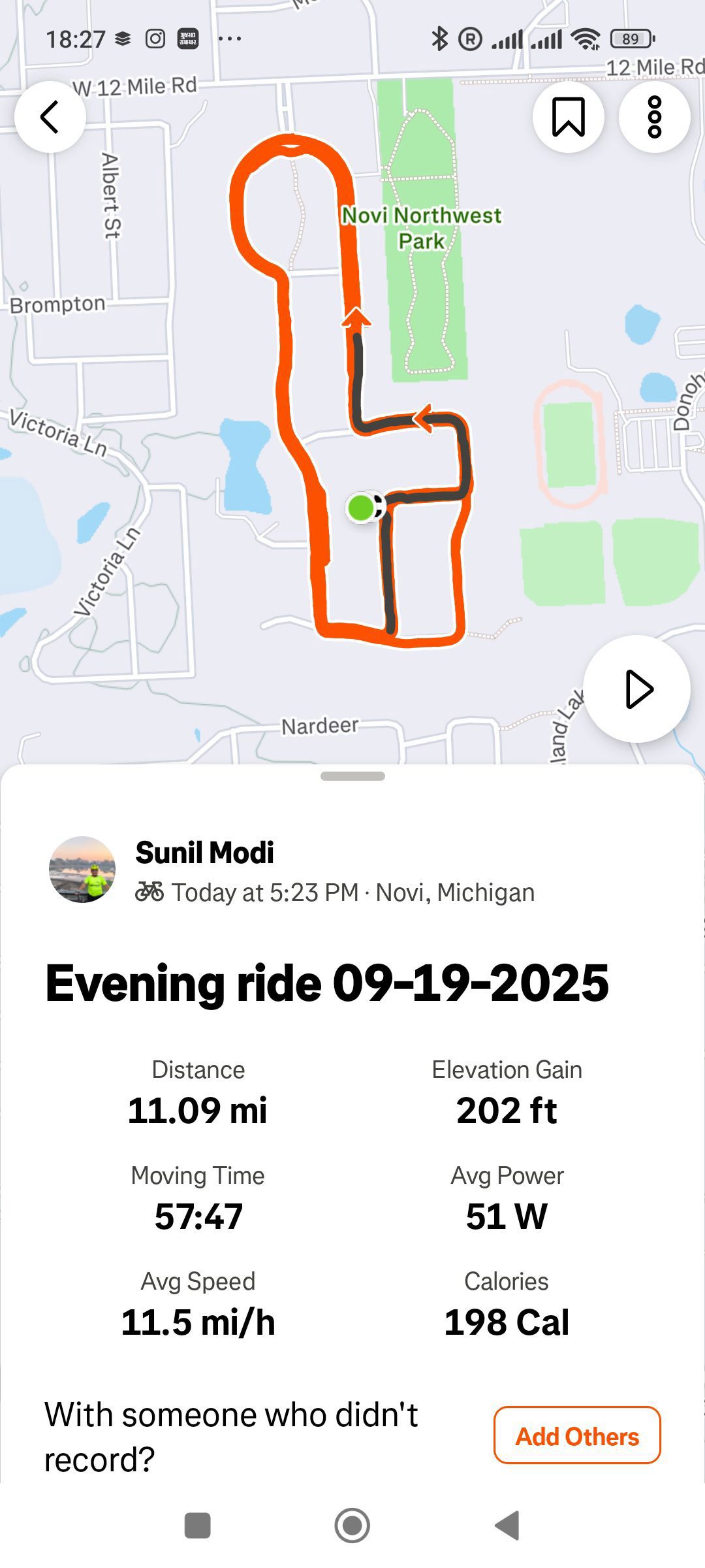11.1 mi ride - Evening ride 19 Sep 2025 - GCC ride#18 - Friday, September 19, 2025